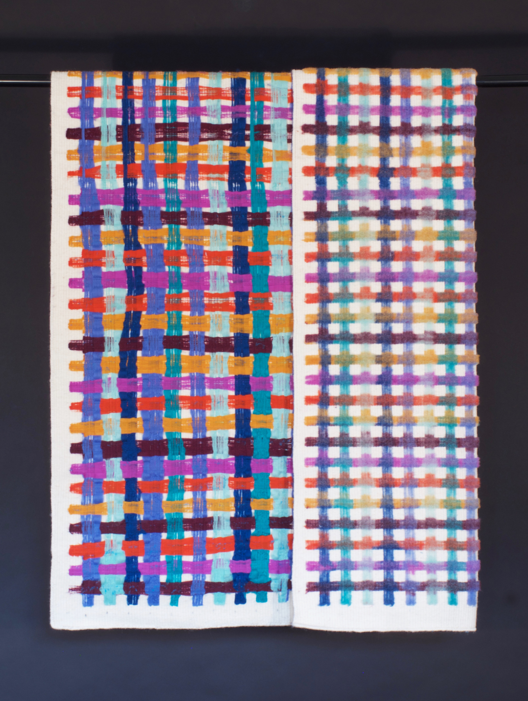 The bold colour palette is common to all three rugs, and whereas the definition of ‘Motley Check’ and ‘Motley Grid’ is sharply defined, the painterly composition of colours brings a random spontaneity to the rugs. ‘Motley Palette’ takes the idea to a conclusion by being a solid felted exploration of colour. What is extraordinary about the technique is that the reverse of the rug is a vibrant, more intensely coloured mirror of the front. A rug with two faces.